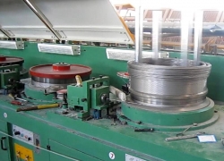 4、中拉:高架放線 →在線皮膜 → 在線烘干(≥φ1.8mm的原料) → LZ9/400直線式拉絲機組 → 張力架 → 清洗槽 → SG740工字輪收線機(φ3.5mm以下的不銹鋼絲最小拉到φ0.5mm)