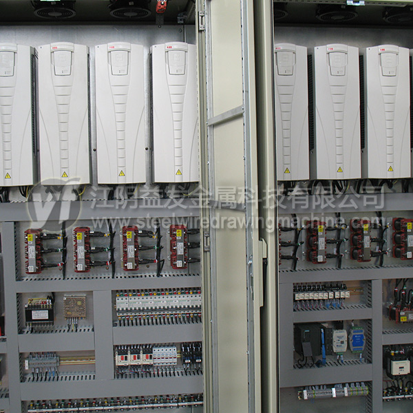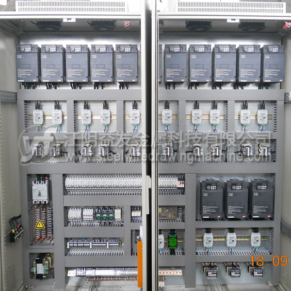 14、交流變頻直線式拉絲機電氣控制系統:本系統采用變頻器調速,PLC程序控制器集控的方式,實現數字化自動化控制。機臺上每個頭都有啟動、停止、點動按鈕、張力氣壓調節;機臺前緊急停車拉繩。觸摸屏上有速度顯示與調速,重量或者長度設定或解除。運行機臺號,運行電流(觀察電流大小可以清晰知道模具磨損狀態),運行頻率(觀察頻率大小可以知道實際*大工作速度),每個頭的功率。觸摸屏上輸入實際運行的模具,可以直觀的顯示每道次的減面率,避免不合理的拉拔,通過觀察電流的波動可以發現并調整損壞的模具避免生產廢絲!系統還具備一些特色功能:穿絲點動永不斷絲功能,高速運行中斷絲自動緊急停車功能,遠程監控檢修功能。所以高自動化智能化的電氣控制系統是高效低成本高質量拉拔低碳鋼絲的**技術。